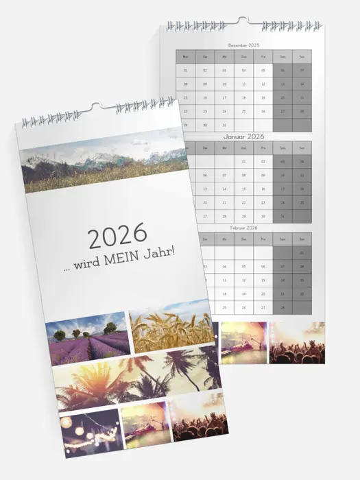 Unsere 3 Monats Kalender sind in der Größe 297 × 630 mm erhältlich. Sie haben die Wahl zwischen hochwertigem Echtfotopapier und Bilderdruckpapier. Beide Optionen bieten eine hervorragende Druckqualität, sodass Ihre Fotos und Motive perfekt zur Geltung kommen.